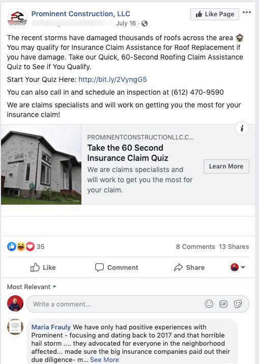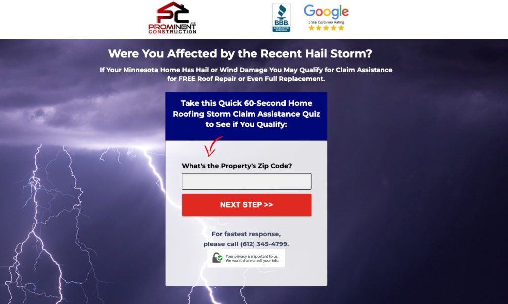 Being able to target hail damaged areas as well as audiences that were most likely to be interested in their help allowed us to use simple ad targeting to get long form information Hail Damage roofing leads for $50-60 on average. We’re talking not just name and phone, but everything we need on the status of the home.