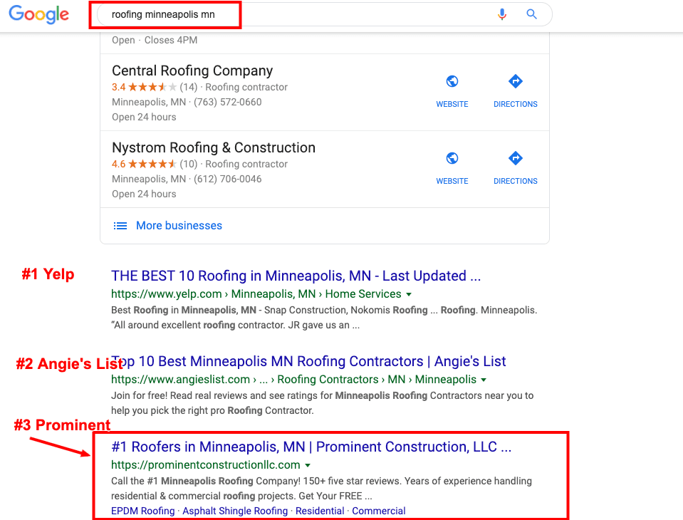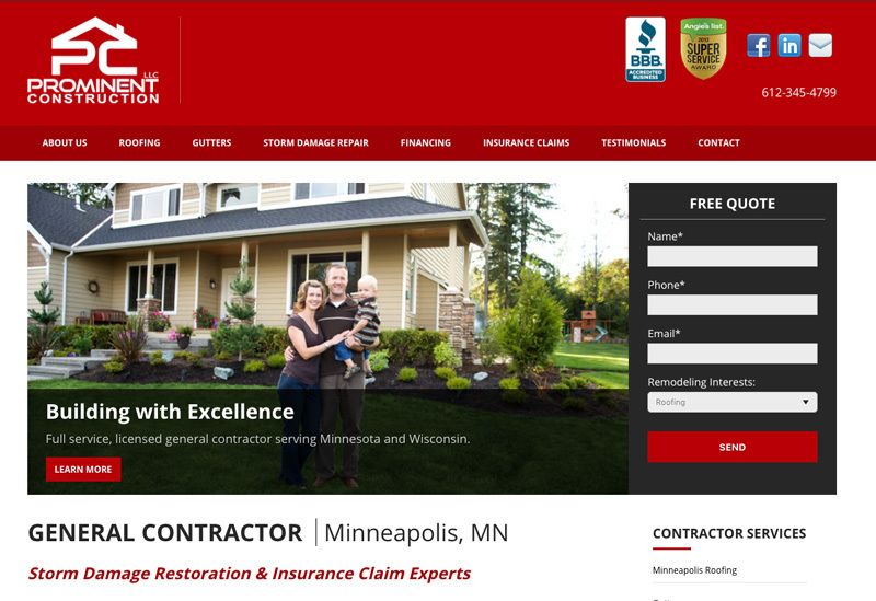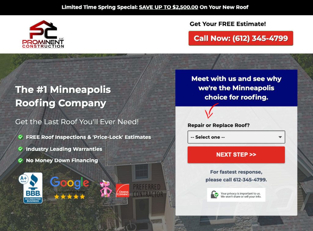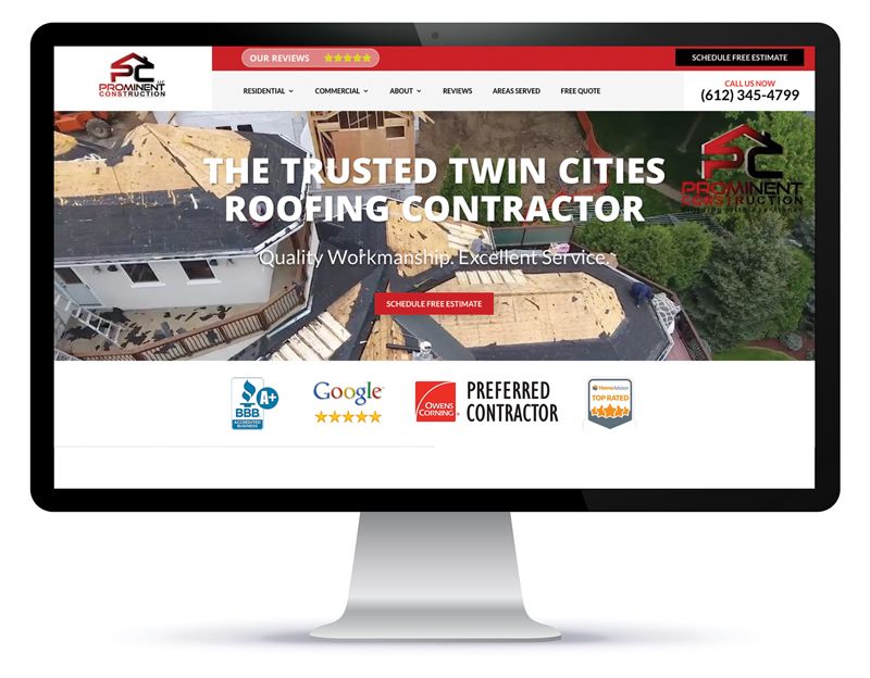 Let’s lay down the facts before we get started here. When we began working with Prominent Construction, a roofing contractor based out of Minneapolis, MN, about 2 years ago, their online presence was severely lacking.They barely had a website, weren’t running any advertising, and didn’t show up on Google search anywhere in their local area. They needed a way to generate leads from their own branded properties, and we both knew that they needed to accomplish this online, not offline.