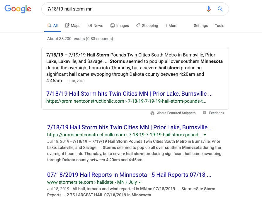 Fast forward to end of 2019 and they’re everywhere in teh Minneapolis area, as well as ranked at the top of organic search results for pretty much all “Minneapolis Roofing” terms.