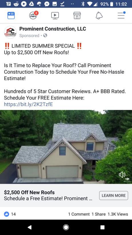 Ad #1: Ad with Video of them working with text that reiterated the benefits of their warranty, financing options, and the fact they were a local contractor with hundreds of 5 star customer reviews.