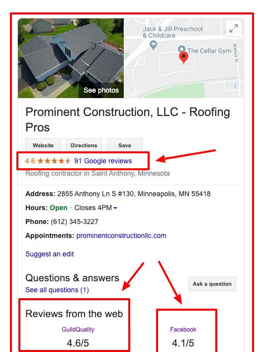 Google Reviews are the ones that stand out on your maps listing, so if you come up in Google Maps for the search term “roofing contractors in dallas” you better have as many or more reviews as the other 2 competitors, and have a quality rating between 4.5 – 5 stars.